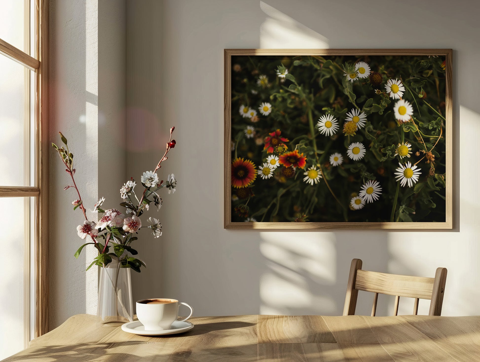 Meadow Dance celebrates the untamed beauty of wildflowers in bloom. With bright white daisies mingling among fiery orange petals, this fine art photograph captures the vibrancy and joy of nature at its most free-spirited. It’s a piece that brings warmth and life into any room.